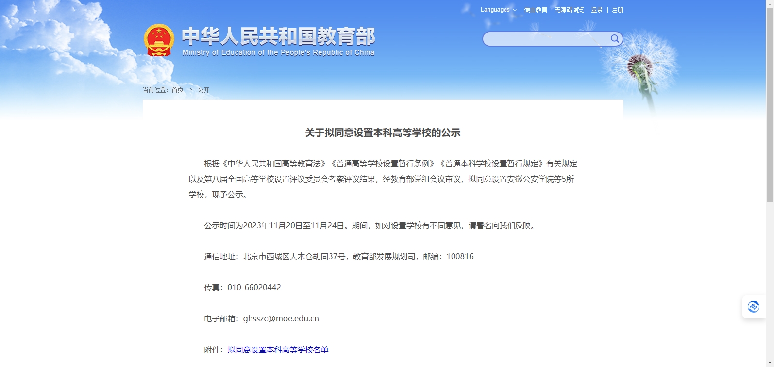 教育部發(fā)布《關(guān)于擬同意設(shè)置本科高等學(xué)校的公示》。公示指出,根據(jù)《中華人民共和國高等教育法》《普通高等學(xué)校設(shè)置暫行條例》《普通本科學(xué)校設(shè)置暫行規(guī)定》有關(guān)規(guī)定以及第八屆全國高等學(xué)校設(shè)置評議委員會考察評議結(jié)果,經(jīng)教育部黨組會議審議,擬同意設(shè)置安徽公安學(xué)院等5所學(xué)校,現(xiàn)予公示。公示時(shí)間為2023年11月20日至11月24日。