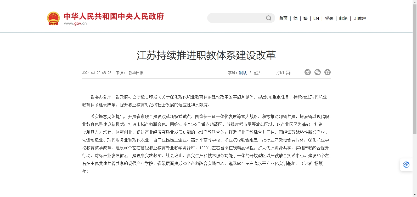 江蘇省省委辦公廳、省政府辦公廳近日印發(fā)《關(guān)于深化現(xiàn)代職業(yè)教育體系建設(shè)改革的實(shí)施意見》,提出8項(xiàng)重點(diǎn)任務(wù),持續(xù)推進(jìn)現(xiàn)代職業(yè)教育體系建設(shè)改革,提升職業(yè)教育對(duì)經(jīng)濟(jì)社會(huì)發(fā)展的適應(yīng)性和貢獻(xiàn)度。