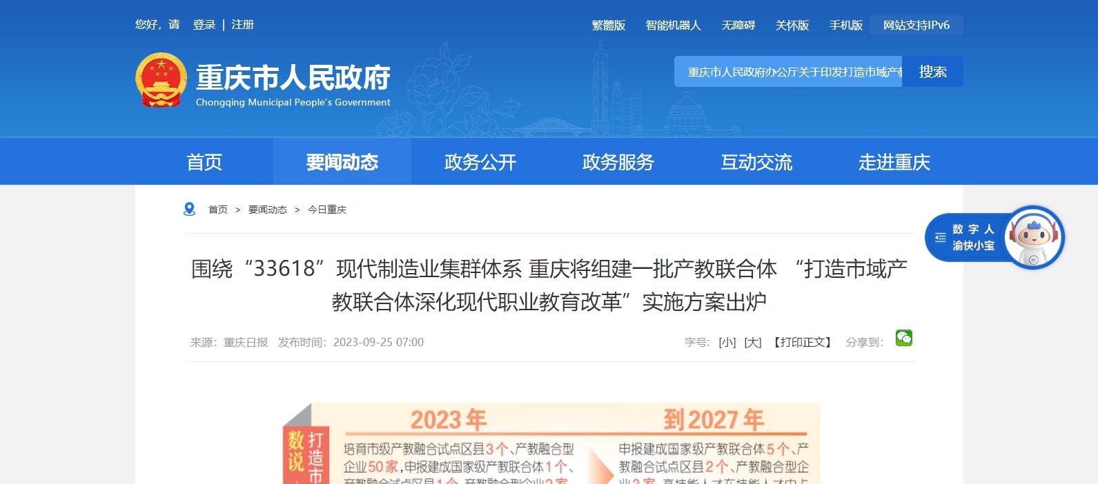 圍繞“33618”現(xiàn)代制造業(yè)集群體系 重慶將組建一批產(chǎn)教聯(lián)合體 “打造市域產(chǎn)教聯(lián)合體深化現(xiàn)代職業(yè)教育改革”實(shí)施方案出爐 從市政府辦公廳獲悉,《重慶市人民政府辦公廳關(guān)于印發(fā)打造市域產(chǎn)教聯(lián)合體......