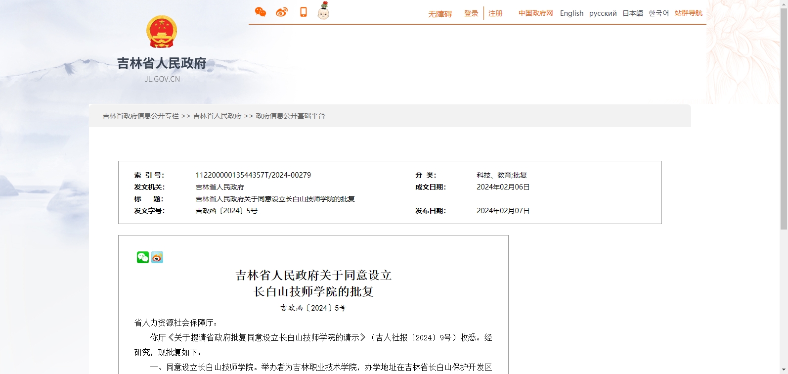 吉林省人民政府關(guān)于同意設(shè)立長白山技師學(xué)院的批復(fù) 吉政函〔2024〕5號(hào) 省人力資源社會(huì)保障廳: 你廳《關(guān)于提請(qǐng)省政府批復(fù)同意設(shè)立長白山技師學(xué)院的請(qǐng)示》......