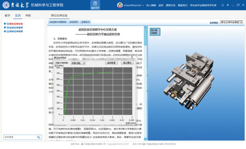 【項目概述】 實驗項目“材料原位拉伸虛擬仿真實驗”,由國家重大科學儀器設備開發(fā)專項:“材料力學性能原位測試儀器與軟件系統(tǒng)的研制開發(fā)(2012YQ03007501)”、國家自然科學基金優(yōu)秀青年基金:“材料微觀力學性能原位測試技術與應用(51422503)”、國家“863”計劃重大項目課題:“跨尺度原位力學測試新技術與儀器裝備的開發(fā)制造(2012AA041206)”、國家自然科學基金項目:“接近服役條件下材料微觀力學性能原位測試新技術的研究(51275198)”等多個國家級科研項目或課題的科研成果轉(zhuǎn)化而來,列為吉林大學開放創(chuàng)新實驗項目,用于大學生科技創(chuàng)新能力訓練。