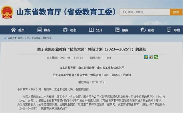 為深入貫徹黨的二十大精神,落實(shí)中共中央辦公廳、國(guó)務(wù)院辦公廳《關(guān)于深化現(xiàn)代職業(yè)教育體系建設(shè)改革的意見》(中辦發(fā)〔2022〕65號(hào)),根據(jù)山東省教育廳等5部門《關(guān)于印發(fā)山東省深化新時(shí)代職業(yè)教育教師隊(duì)伍建設(shè)改革實(shí)施方案的通知》要求,為發(fā)揮高技能人才的示范引領(lǐng)作用,加強(qiáng)職業(yè)院?!半p師型”教師隊(duì)伍建設(shè),經(jīng)研究,決定實(shí)施職業(yè)教育“技能大師”領(lǐng)航計(jì)劃(2023—2025年)?,F(xiàn)將有關(guān)事項(xiàng)通知如下: