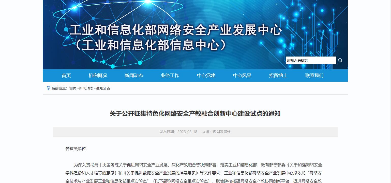 5月18日,工業(yè)和信息化部網(wǎng)絡(luò)安全產(chǎn)業(yè)發(fā)展中心發(fā)布關(guān)于公開征集特色化網(wǎng)絡(luò)安全產(chǎn)教融合創(chuàng)新中心建設(shè)試點(diǎn)的通知,首批擬征集30所有基礎(chǔ)、有意愿、有能力、有特色的院校參與網(wǎng)絡(luò)安全產(chǎn)教融合創(chuàng)新中心試點(diǎn)建設(shè),形成可復(fù)制、能推廣、有示范的經(jīng)驗(yàn)做法。