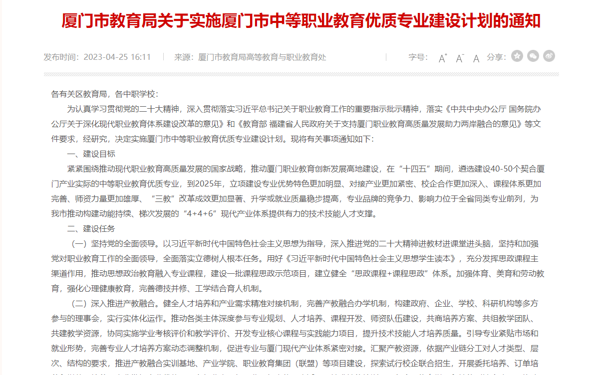 為認(rèn)真學(xué)習(xí)貫徹黨的二十大精神,深入貫徹落實(shí)習(xí)近平總書記關(guān)于職業(yè)教育工作的重要指示批示精神,落實(shí)《中共中央辦公廳 國務(wù)院辦公廳關(guān)于深化現(xiàn)代職業(yè)教育體系建設(shè)改革的意見》和《教育部 福建省人民政府關(guān)于支持廈門職業(yè)教育高質(zhì)量發(fā)展助力兩岸融合的意見》等文件要求,經(jīng)研究,決定實(shí)施廈門市中等職業(yè)教育優(yōu)質(zhì)專業(yè)建設(shè)計(jì)劃。現(xiàn)將有關(guān)事項(xiàng)通知如下: