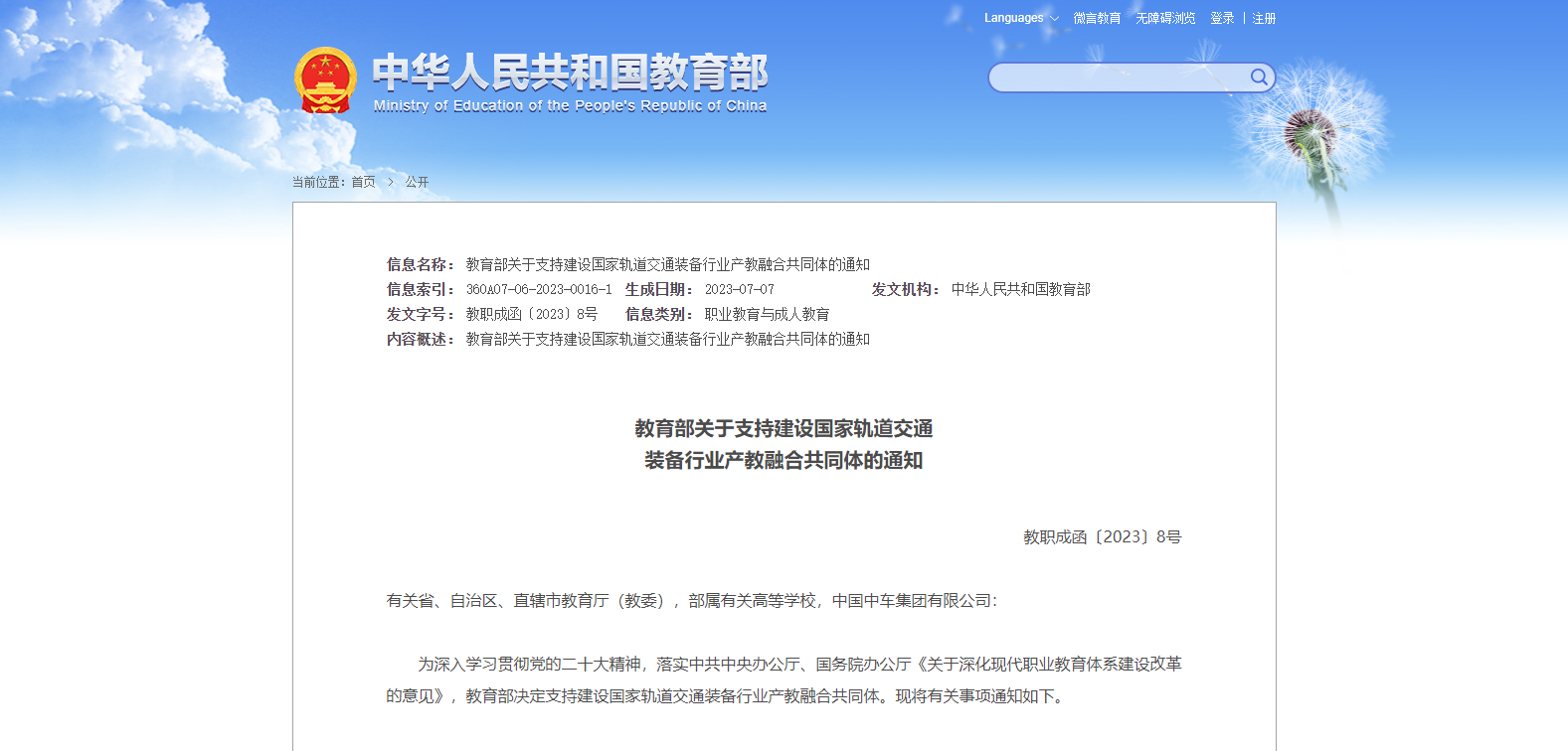為深入學習貫徹黨的二十大精神,落實中共中央辦公廳、國務院辦公廳《關于深化現(xiàn)代職業(yè)教育體系建設改革的意見》,教育部決定支持建設國家軌道交通裝備行業(yè)產(chǎn)教融合共同體?,F(xiàn)將有關事項通知如下。