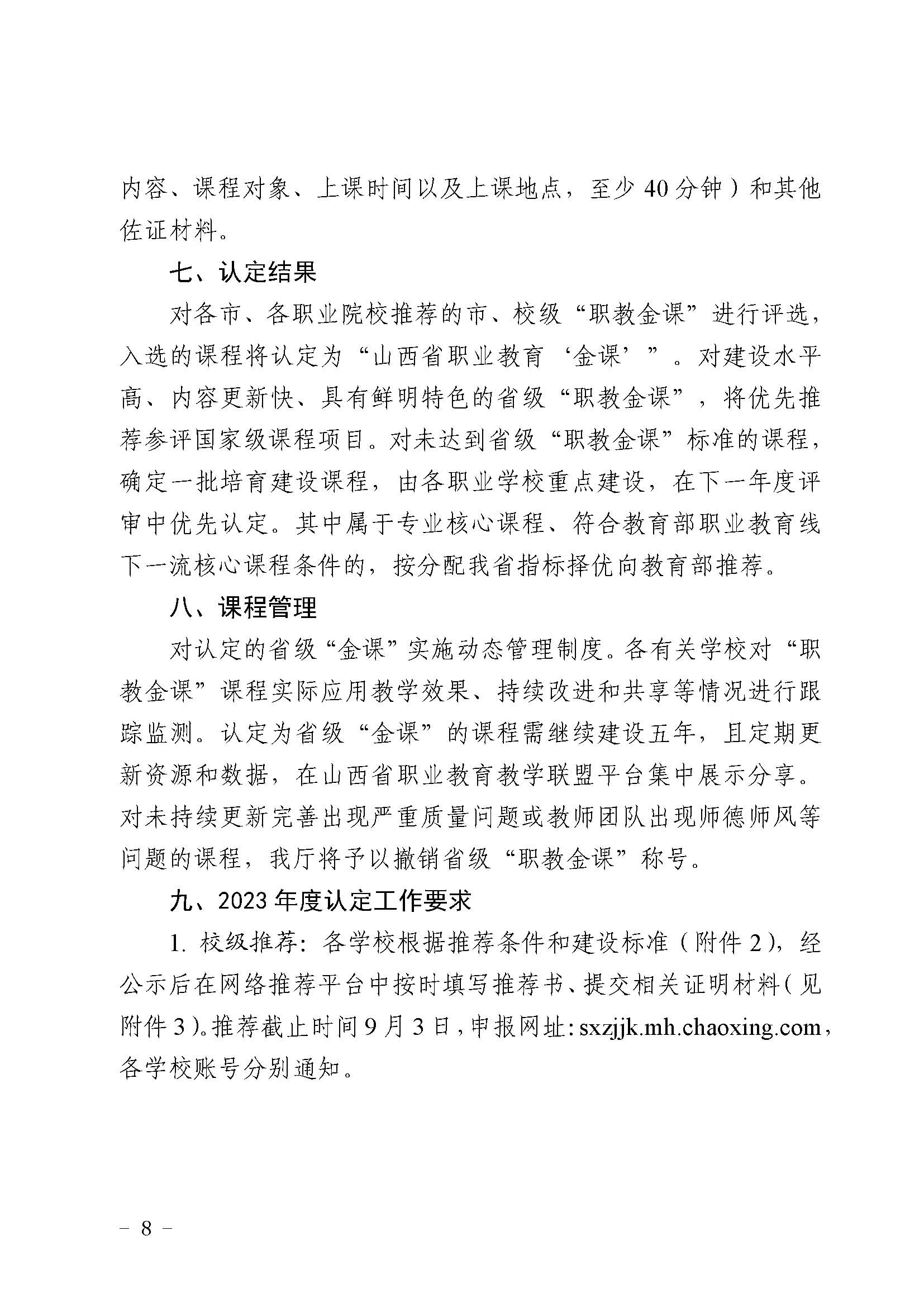 近日,山西省教育廳、山西省人力資源和社會(huì)保障廳聯(lián)合發(fā)布關(guān)于實(shí)施山西省職業(yè)院校“職教金課”建設(shè)的通知,根據(jù)《意見》中“實(shí)施‘職教金課’建設(shè),培育、建設(shè)、認(rèn)定一批精品課程”的要求,繼續(xù)推進(jìn) 200 門在線精品課程(線上“金課”)建設(shè)工作,進(jìn)一步推動(dòng)先進(jìn)教學(xué)方法和現(xiàn)代教學(xué)手段在教學(xué)中的應(yīng)用,引深教師、教法、教材領(lǐng)域的改革,到 2025 年再建設(shè) 600 門左右“職教金課”,包括線下“金課”、線上線下混合式“金課”、虛擬仿真教學(xué)“金課”和社會(huì)實(shí)踐“金課”,提升課程的高階性,突出課程的創(chuàng)新性,增加課程的挑戰(zhàn)度,推動(dòng)課程思政的理念形成廣泛共識(shí),確立學(xué)生中心、產(chǎn)出導(dǎo)向、持續(xù)改進(jìn)的理念,形成職業(yè)教育特色鮮明的課程集群。