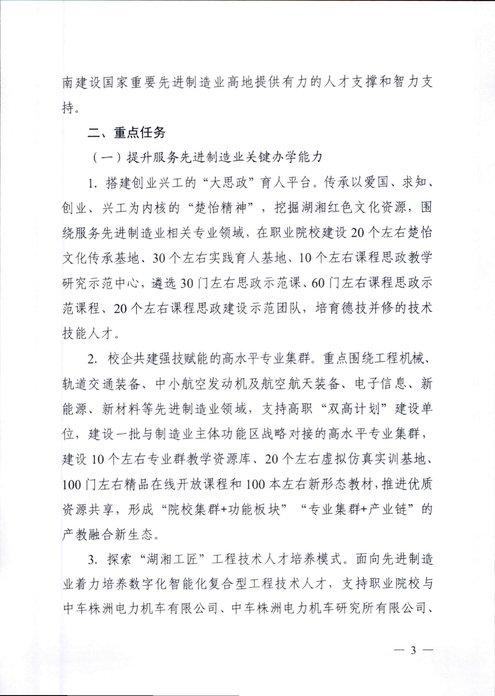 為深入學(xué)習(xí)貫徹黨的二十大精神,落實(shí)《關(guān)于深化現(xiàn)代職業(yè)教育體系建設(shè)改革的意見(jiàn)》,進(jìn)一步深化職業(yè)教育產(chǎn)教融合,助力國(guó)家重要先進(jìn)制造業(yè)高地建設(shè),依據(jù)《中華人民共和國(guó)職業(yè)教育法》,教育部和湖南省人民政府特制定本實(shí)施方案。其中重要任務(wù)中提及:2.校企共建強(qiáng)技賦能的高水平專(zhuān)業(yè)集群。重點(diǎn)圍繞工程機(jī)械、軌道交通裝備、中小航空發(fā)動(dòng)機(jī)及航空航天裝備、電子信息、新能源、新材料等先進(jìn)制造業(yè)領(lǐng)域,支持高職“雙高計(jì)劃”建設(shè)單位,建設(shè)一批與制造業(yè)主體功能區(qū)戰(zhàn)略對(duì)接的高水平專(zhuān)業(yè)集群,建設(shè)10個(gè)左右專(zhuān)業(yè)群教學(xué)資源庫(kù)、20個(gè)左右虛擬仿真實(shí)訓(xùn)基地、100門(mén)左右精品在線(xiàn)開(kāi)放課程和100本左右新形態(tài)教材,推進(jìn)優(yōu)質(zhì)資源共享,形成“院校集群+功能板塊”“專(zhuān)業(yè)集群+產(chǎn)業(yè)鏈”的產(chǎn)教融合新生態(tài)。