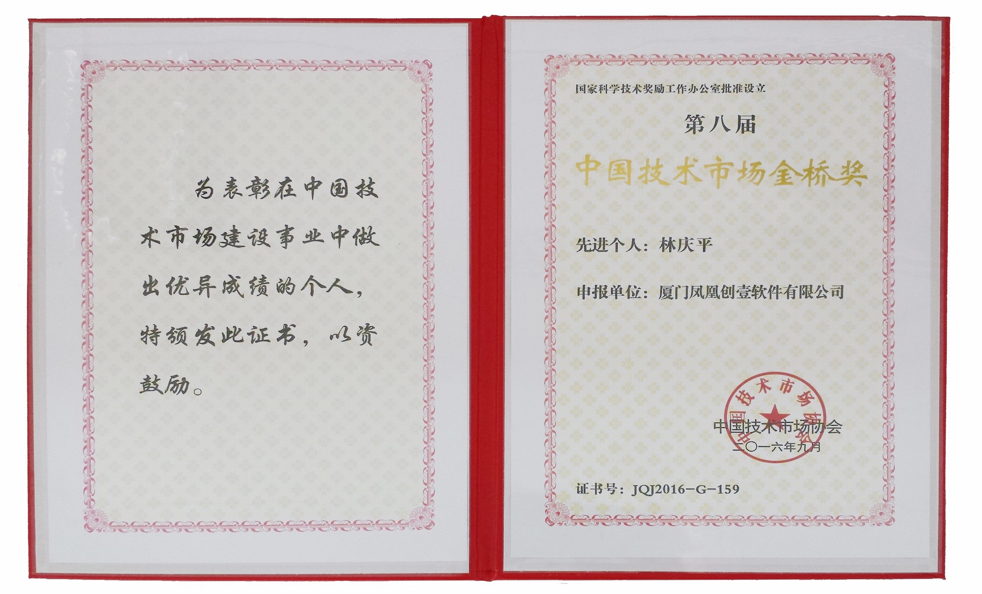 日前,中國技術(shù)市場協(xié)會(huì)公布了“第八屆中國技術(shù)市場金橋獎(jiǎng)”獲獎(jiǎng)名單,本司(廈門鳳凰創(chuàng)壹軟件有限公司www.metropolegallery.com)總經(jīng)理兼技術(shù)總監(jiān)林慶平博士榮膺“第八屆中國技術(shù)市場金橋獎(jiǎng)金橋獎(jiǎng)......