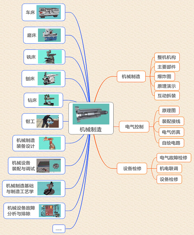 本教學(xué)軟件是一個(gè)集大量教學(xué)、實(shí)訓(xùn)、考核于一體的開(kāi)放性教學(xué)平臺(tái),涵蓋了機(jī)械制造技術(shù)與制造工藝學(xué)、材料表面性能及測(cè)試、機(jī)械制造裝備設(shè)計(jì)、鉗工、焊接、機(jī)械設(shè)備裝配與調(diào)試、機(jī)械設(shè)備故障分析與排除所需教學(xué)實(shí)訓(xùn)仿真資源。